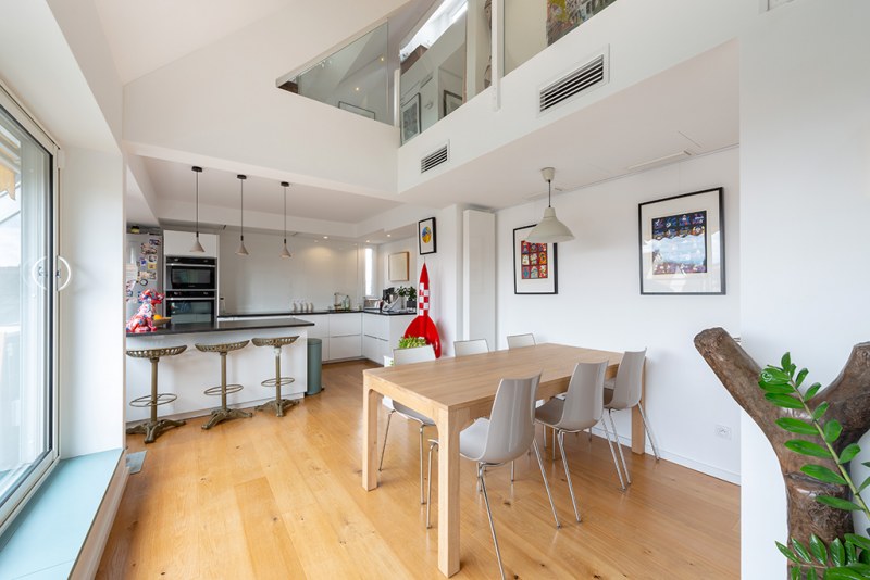 Ce projet nous a amené à transformer radicalement un appartement en duplex sous comble. Cet appartement ne bénéficiait pas de chambre fermée jusqu’à lors, le projet en propose désormais deux. Nous avons également créé une troisième chambre, ancienne chambre de bonne accessible uniquement depuis la circulation commune, en ménageant une porte dans le mur séparatif de l’appartement. La cuisine fermée a été décloisonnée et déplacée, elle est maintenant ouverte sur le séjour. Celui-ci bénéficie d’une belle double hauteur, d’un accès direct sur la terrasse à la hollandaise et d’une vue sur les toits. L’enjeu était d’ajouter de la surface dans cet appartement sans l’étouffer et en valorisant ses caractéristiques exceptionnelles. Une passerelle a été imaginée au-dessus du séjour, avec un garde-corps vitré afin de préserver la communication visuelle entre les différents espaces de l’appartement, procurant ainsi une véritable sensation d’ouverture.