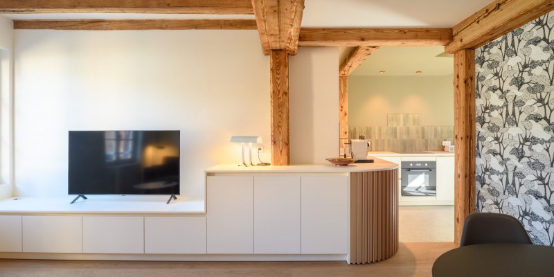 Projet de rénovation d’un appartement ancien en valorisant les éléments anciens de charpente et la double-orientation du bien. Les espaces secondaires ont été optimisés au maximum afin de libérer le plus d’espace possible dans les pièces nobles.