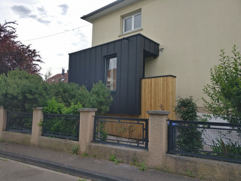 Chantier en cours pour ce projet d’extension de maison individuelle. Ce projet visait à créer un petit ajout de surface à la maison pour créer une entrée et un WC au rez-de-chaussée. Nous avons imaginé ce projet en structure à ossature bois habillé de bardage zinc à joint debout et bardage bois ajouré.