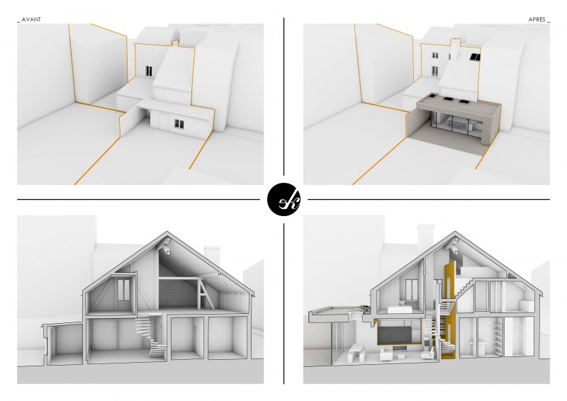 Il s’agit pour ce projet de réhabiliter un ancien atelier de boucherie inutilisé depuis des dizaines d’années en logement. Cette construction à colombages est facilement exploitable en agréable maison familiale. Le projet consiste à occuper tout le volume de la construction principale et à s’étendre sur le jardin en démolissant la dépendance et en reconstruisant un volume à toiture plate, largement ouvert sur le jardin en coeur d’îlot. Cette large baie vitrée permettra d’éclairer les pièces de vie qui sont implantées à la fois dans la construction neuve et dans l’existante. Au rez-de-chaussée de l’ancien atelier, un garage double est aménagé. L’entrée sur la rue est accompagnée de locaux annexes. Au 1er étage sont installées trois chambres, de généreux dressing et une salle-de-bains familiale. En bonus, des mezzanines sont aménagées sur les volumes des chambres et des pièces d’eau pour apporter des espaces de jeu, de rangement ou de couchage pour les invités.