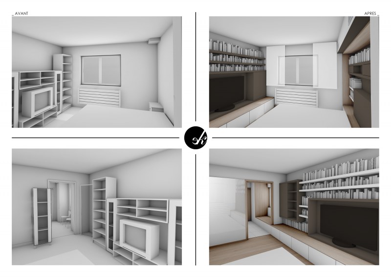 Le projet consiste en l’aménagement des trois chambres et du dressing d’une maison individuelle. Il s’agit de dessiner des meubles intégrant plusieurs fonctions : rangements divers, emplacement pour un téléviseur, bureau, etc. Le projet prévoit également la création de faux-plafond pour l’implantation d’un système de climatisation. Les matériaux proposés reprennent ceux déjà présents dans la maison pour se fondre au mieux dans l’existant et créer une véritable harmonie.