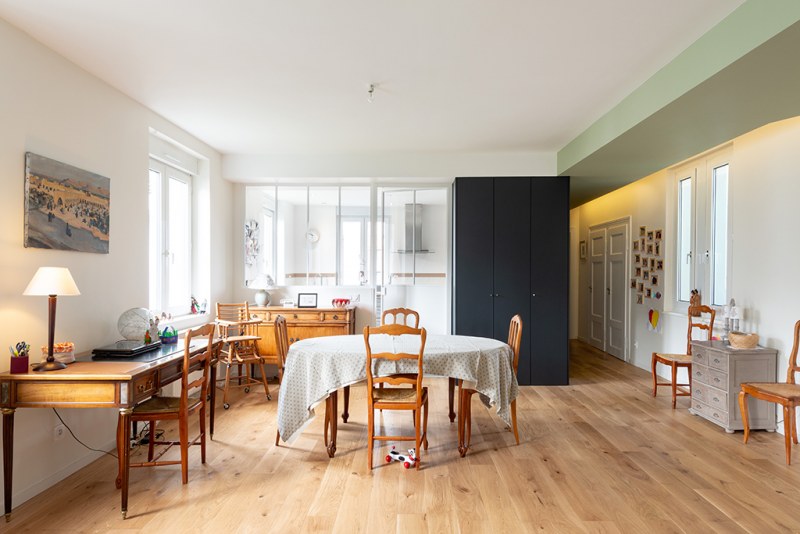 Encore une fois, la demande était complexe : aménager quatre chambres et un espace de vie spacieux et cuisine séparée dans un appartement ancien d’à peine 110m². L’espace de vie a été ouvert sur la circulation pour bénéficier d’une triple orientation : côté rue, côté cour et côté cuisine par une verrière. Les vues traversantes offrent une belle respiration à cet espace de vie familial et central. Il dessert deux chambres, deux autres chambres sont accessibles depuis l’entrée. Les espaces ont été optimisés pour valoriser chaque mètre carré de surface. Un appartement où il fait bon vivre ensemble mais où l’intimité de chacun n’est pas sacrifiée !